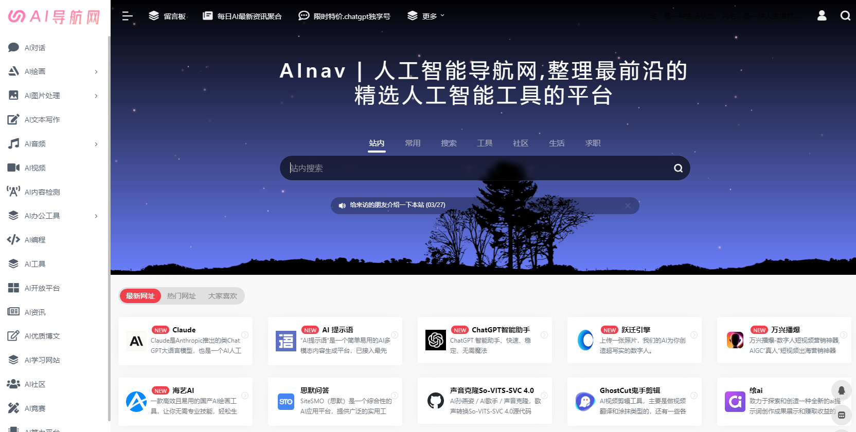 https://17yongai.com 一个国人创建的AI导航网站,除了集成了国内外的各大著名AI网站,还会有专门的注册和使用指南和相关资讯,可以说是非常贴心了!