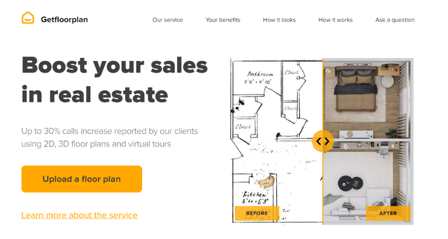 Getfloorplan使用 360 度虚拟游览和 AI 将 2D 平面图转换为 3D 布局。通过这一点,可以确定设计的优势和劣势,并确定需要增强和简化的领域。