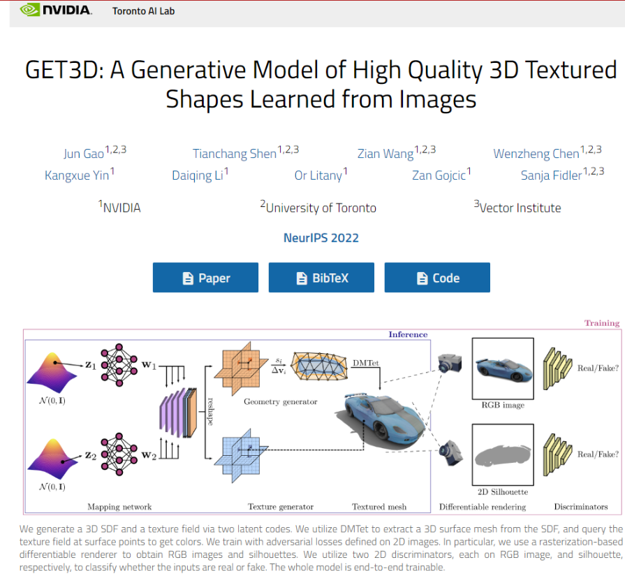 GET3D (Nvidia)从图像中学习的高质量 3D 纹理形状的生成模型。