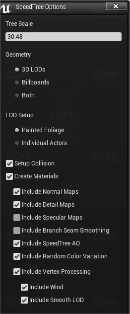 2、在导入对话框时,会显示多个选项。首先是3D几何体,布告板,或者两者之间的选择。如果一棵树只用于近景,它就是一棵“英雄”树,否则当布告板设置为最低LOD时,就会出现问题(因为有时动态阴影会投射在平坦的布告板几何上),可以选择忽略布告板网格。如果一棵树只用于远景,需要减少3D几何载,则只能导入布告板。只导入布告板网格体也会创建一个静态网格体,可以和UE4的植物图层一起使用。