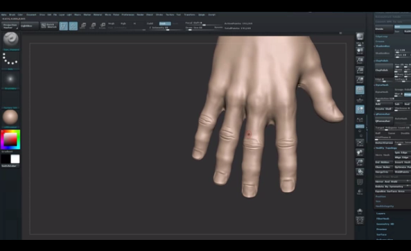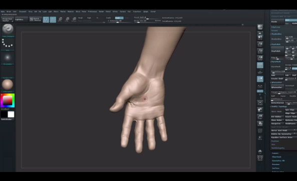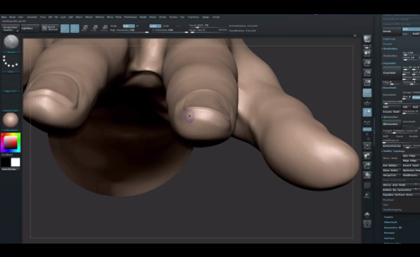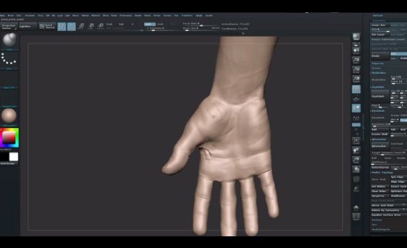使用半径较小的Dam Standard笔刷在手的两边和手腕背面添加非常微小的细节,完成之后,将手转过来检查整只手,你也许会注意到,手仍然太平坦,幸运的是这一点很容易调整,但需要先切换到较低的分辨率级别,这样才不会打破更高级别的细节。