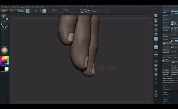 现在,我们将雕刻拇指和手掌之间的区域,切换到即将集中雕刻皱痕的关节部位之前,试着细化外观,先用Inflate笔刷,然后用Pinch笔刷,在那些皱痕上做另一些雕刻通道。