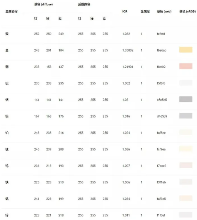 由于金属中没有漫反射颜色,漫反射颜色变成所谓的基色(base color) – 或反照率颜色(albedo color)。