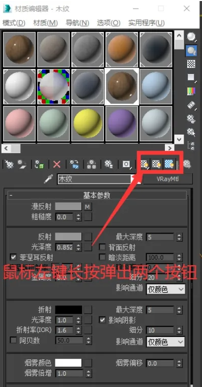 点击一次后会发现材质的纹理贴图都显示了,这个时候有的还是不能显示怎么回事,这是因为这个按钮它有两个功能,它有子层级。我们鼠标左键按住一直长按,就会出现两个按钮,我们都选择试一下。