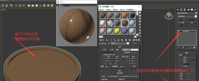 直接点击关闭掉它,材质球就会显示正确。但是现在我们看到给了UVW贴图模型还是显示不正常,此时就需要我们关闭UVW贴图修改器中的真实世界贴图大小。