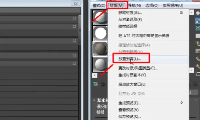 7、然后回到材质编辑器,点击上方工具选项中的材质,在跳出的列表中选择放置到库。