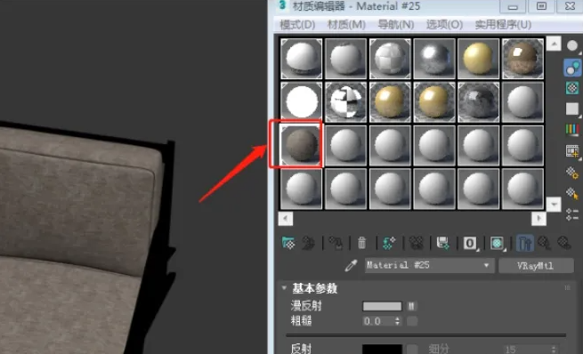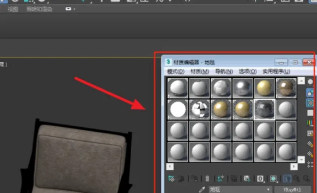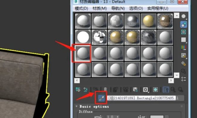4、然后把吸管放置到椅垫上,点击鼠标左键,材质就被吸入刚才选择的材质球中了。