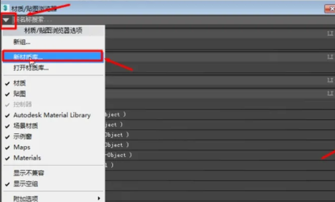 5、然后点击材质球下方一排工具最左边的一个图标,跳出材质/贴图浏览器,点击左上角倒三角,在跳出来的选项中选择新材质库。