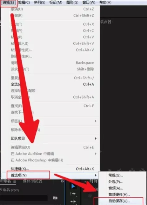 设置PR自动保存:选择:菜单——编辑——首选项——自动保存,