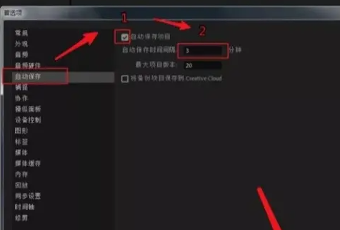 弹出对话框:勾选自动保存项目,间隔时间选择3分钟,点击确定。