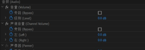 效果控件面板中默认的音频效果里有三项:音量、声道音量及声像器。所有选项都默认开启关键帧。