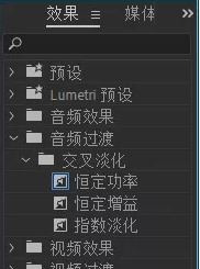 音频过渡。为音频剪辑设置关键帧的方法同视频剪辑。添加完关键帧之后直接拉线条,或者在效果控件面板中的音频效果中的音量/级别中调整,就可以轻松实现渐强渐弱等过渡效果了。效果面板中也提供3个交叉淡化过渡,更加便捷。其中,恒定功率就相当于视频过渡中的交叉溶解,是默认的音频过渡效果。