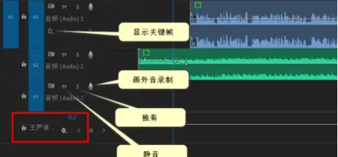 相对视频轨道,音频轨道左侧面板有静音、独奏、画外音录制等三个音频独有的按钮。