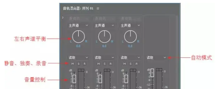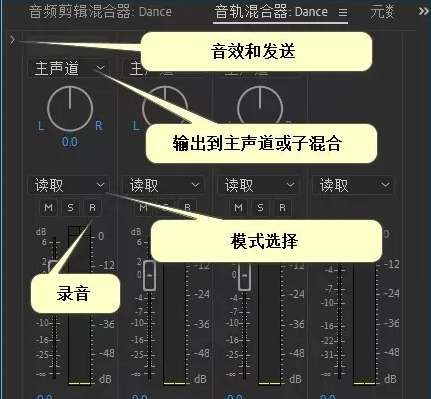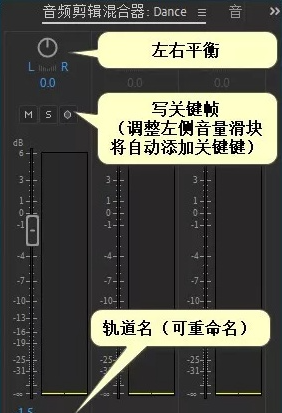 音轨混合器面板是对整条音轨的控制。用于调整整条音轨的左右平衡、音量级别及设置静音、独奏、录制等。还可设置效果和发送,以及选择读写模式。提示:使用音频剪辑混合器进行调整前,时间轴面板左侧面板的“显示关键帧”按钮,选择“轨道关键帧”或者“轨道声像器”,以便直观的观察。