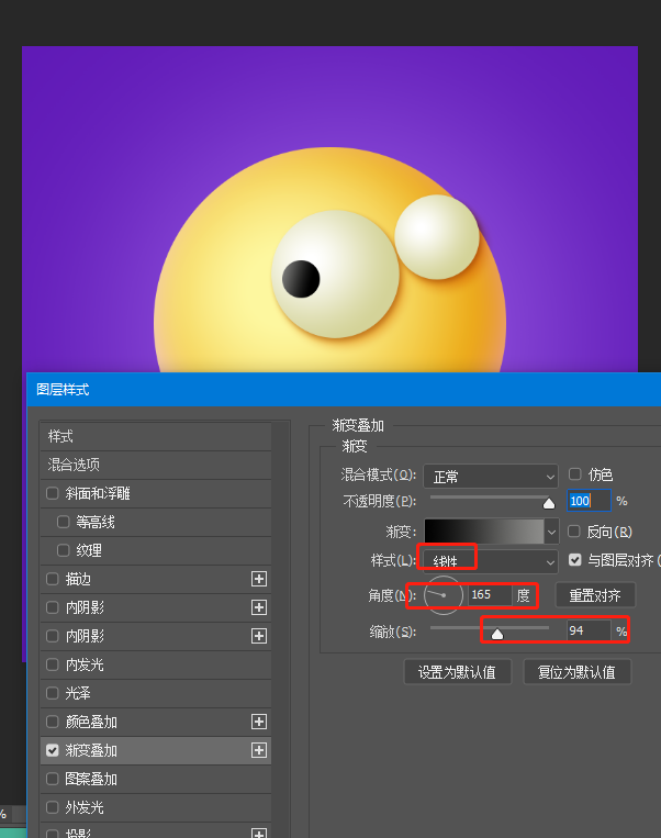 3.7 为「眼珠1」图层添加图层样式,渐变叠加,参数设置如下: