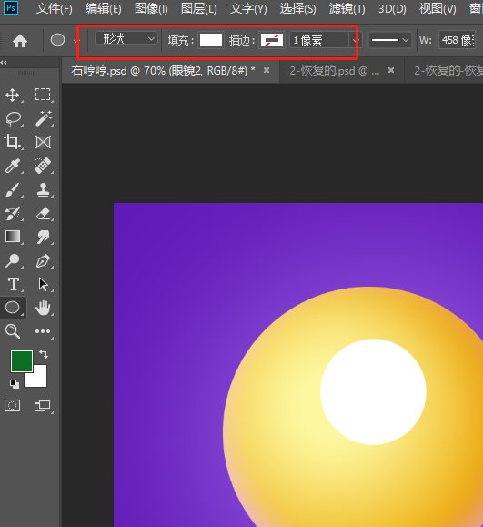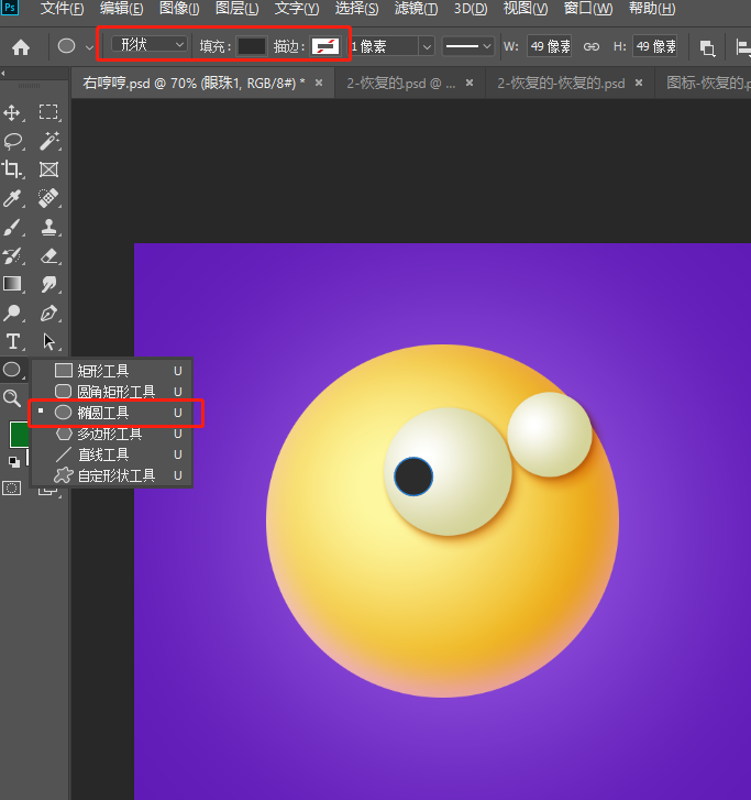 3.6接下来绘制眼珠部分,用椭圆工具(快捷键:U)创建圆形,填充颜色随意,关掉描边,将图层命名为「眼珠1」,参数设置如下: