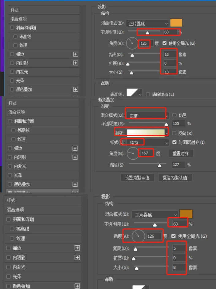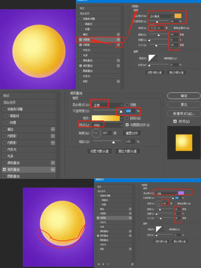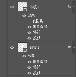 3.4为「眼睛1」图层添加图层样式,内阴影和渐变叠加以及投影,需要注意的是这里有两层投影,要注意投影的上下顺序,参数设置如下: