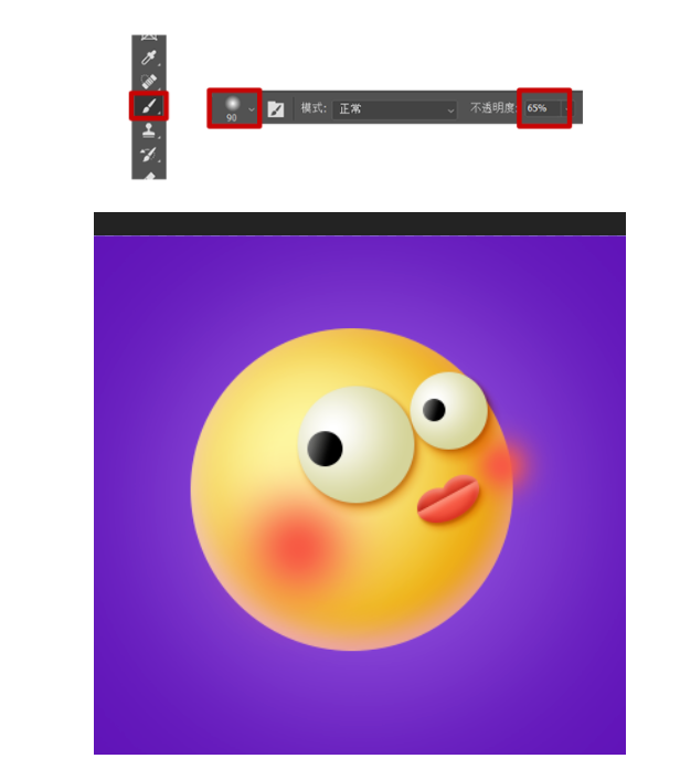 3.12新建图层,命名为「腮红」,用笔刷在如下位置点出两点腮红,笔刷具体参数如下: