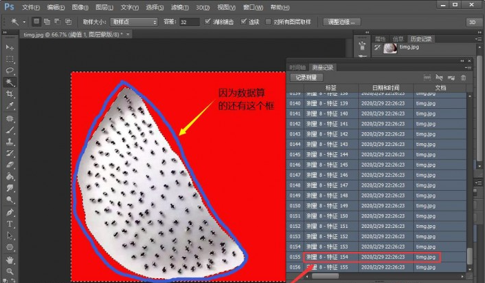 最后,数据已经出来了,因为当时我用套索选的还有这个框,所以也把这个数据算进去了,在这里我们减掉它,也就是说,图中的火龙果籽,一共有154颗