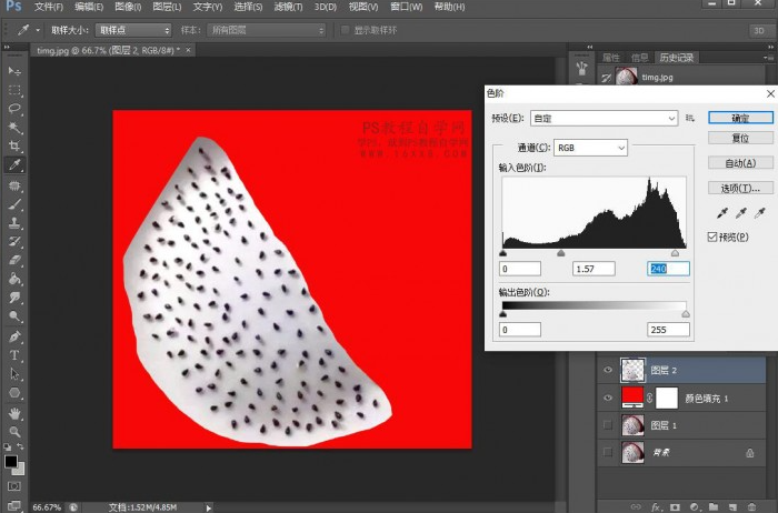 四、Ctrl+L调出色阶,调整一下火龙果籽的黑白对比,因为它不清嘛