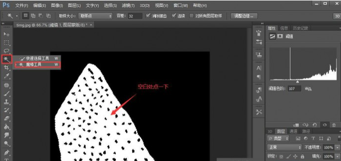 六、现在用魔棒工具在图中箭头所示的空白处点一下,得到火龙果籽的选区