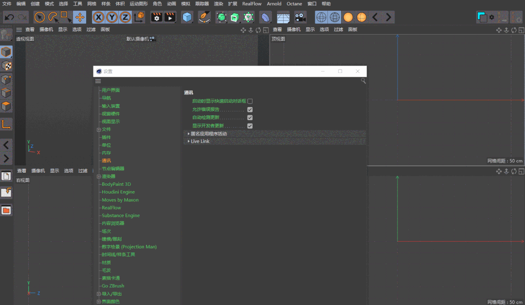 每次打开C4D都会有一个自动更新的弹窗,打开菜单栏的【编辑】-【设置】-【通讯】,去掉【允许错误报告】和【自动检测更新】的勾。
