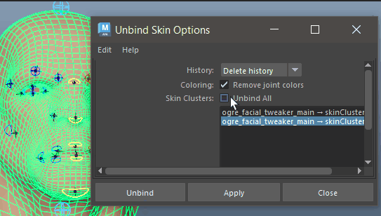 蒙皮集群也带来了增强功能。“取消绑定外观”选项中的新“全部取消绑定”复选框允许选择要取消绑定的外观群集。烘焙变形器工具现在支持多个外观群集。此外,着色骨架选项已恢复到烘焙变形器工具,以便绑定骨架及其外观折点具有相同的颜色。